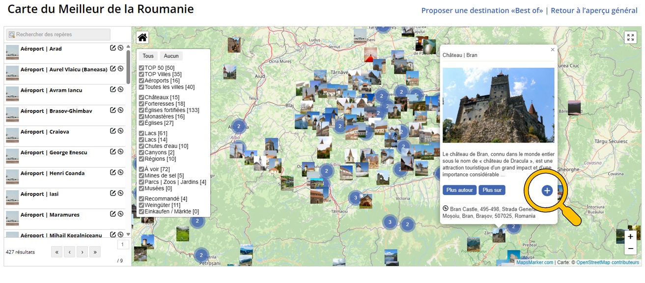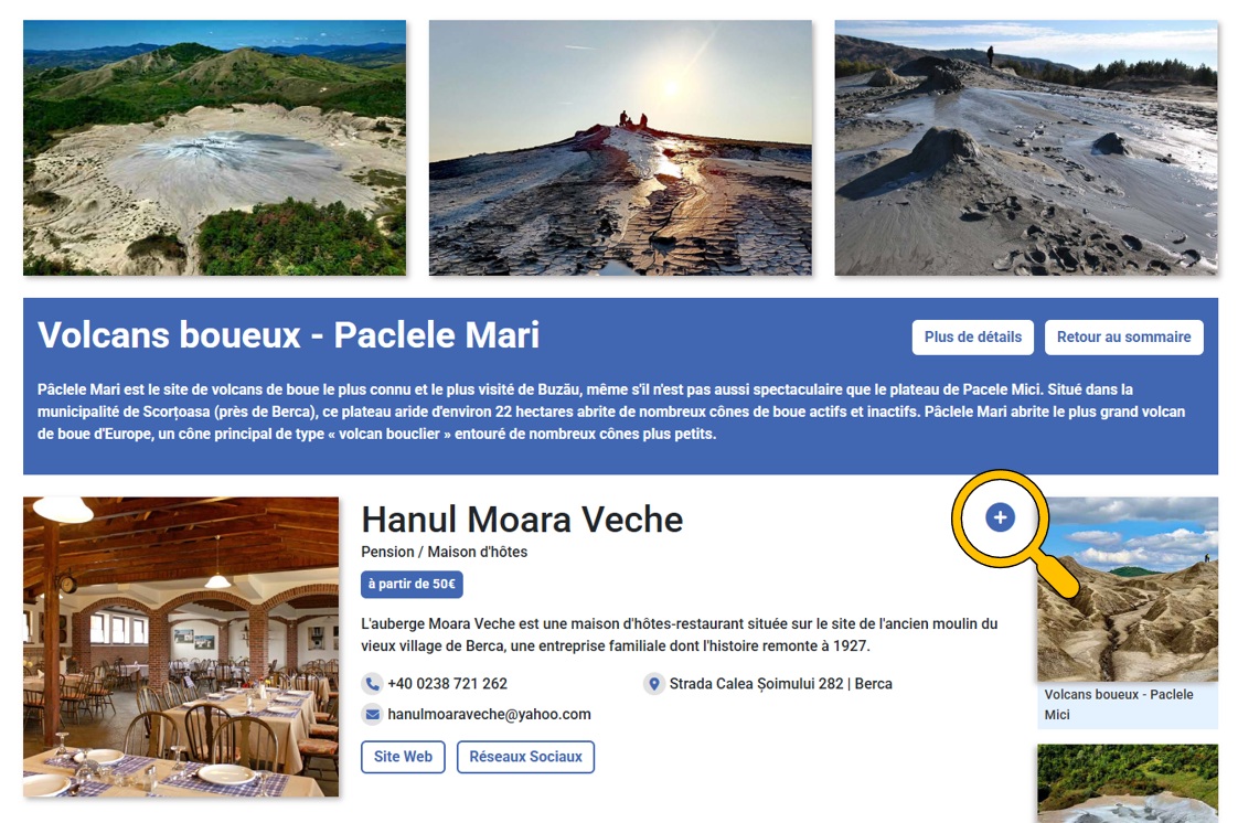 roTravel24 travaille de plus en plus avec des partenaires externes, principalement avec « Urlaub in Rumänien ». (https://urlaub-in-rumänien.de), mais aussi avec Discover Timisoara (https://discover-timisoara.com), Discover Brasov (https://discover-brasov.com) , Discover Sulina (https://discover-sulina.com) Découvrez Valcea (https://discover-valcea.com). Là aussi, vous trouverez le bouton « + » pour de nombreuses destinations et activités/expériences, et en un seul clic, ces destinations seront ajoutées directement à votre itinéraire sur roTravel24 à partir de ces sites web.