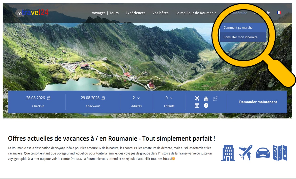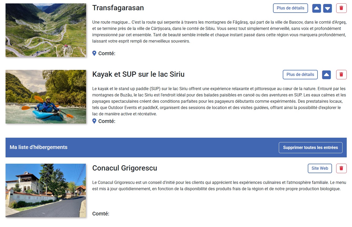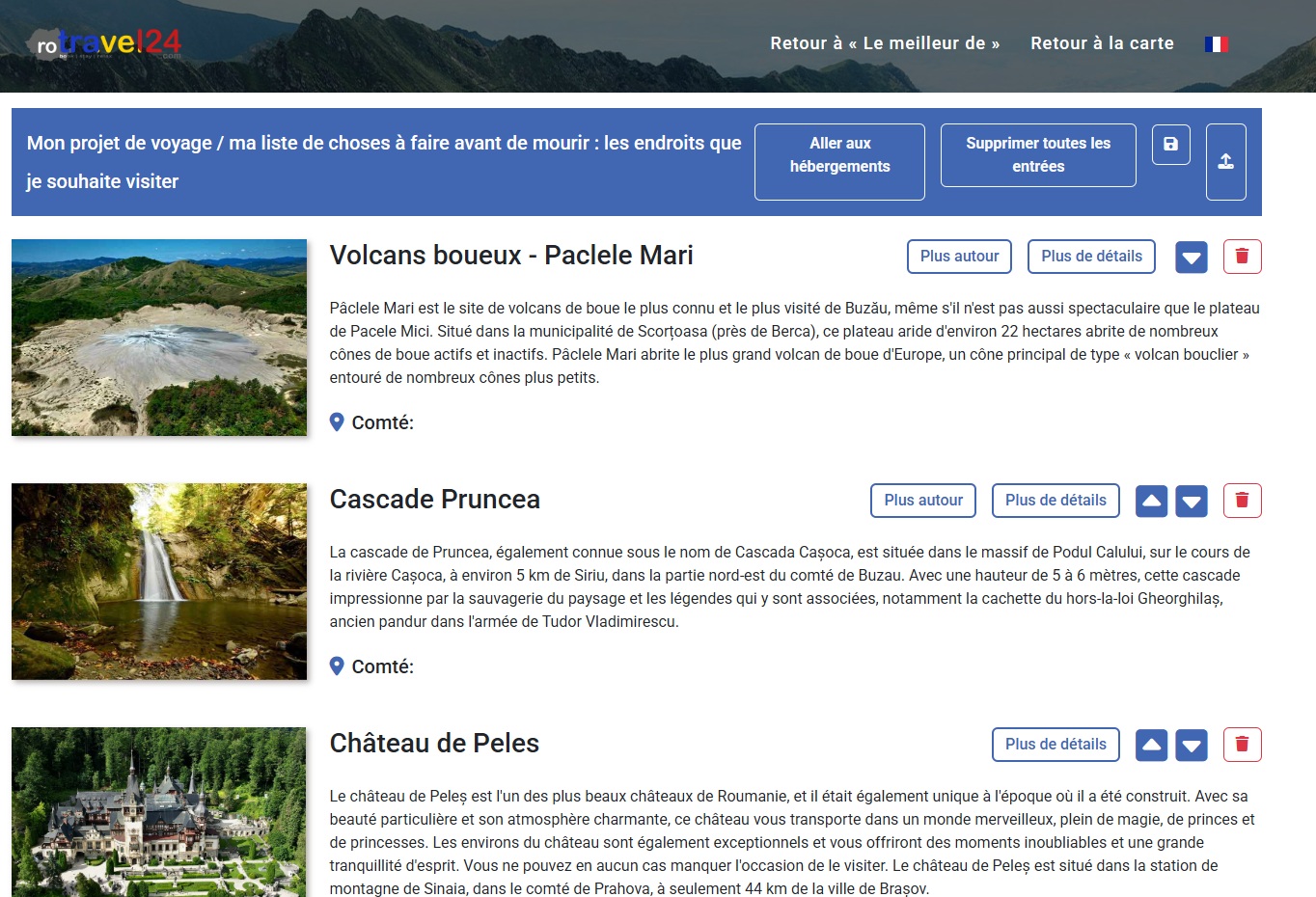 Nous travaillons quotidiennement à l’amélioration de notre offre et à l’enrichissement de notre section « Le meilleur de », ainsi que de nos offres de voyage, expériences et bien plus encore. Actuellement, vous trouverez plus de 400 destinations de voyage en Roumanie dans la section « Le meilleur de ». D’ici la fin de l’année, nous passerons à 800 destinations par semaine, puis à un total de 2 000 en 2026. Nous travaillons également sur la nouvelle fonctionnalité « Mon plan de voyage / Liste de souhaits ». Celle-ci vous permettra d’ajouter des destinations de voyage, ainsi que des hôtels, des caves, des restaurants et bien plus encore à votre plan de voyage personnel. Vous pourrez modifier ce plan de voyage, l’enregistrer, le partager avec vos amis et bien plus encore ! Le travail sur cette fonctionnalité est en cours et, mois après mois, roTravel24 propose de plus en plus de fonctionnalités.