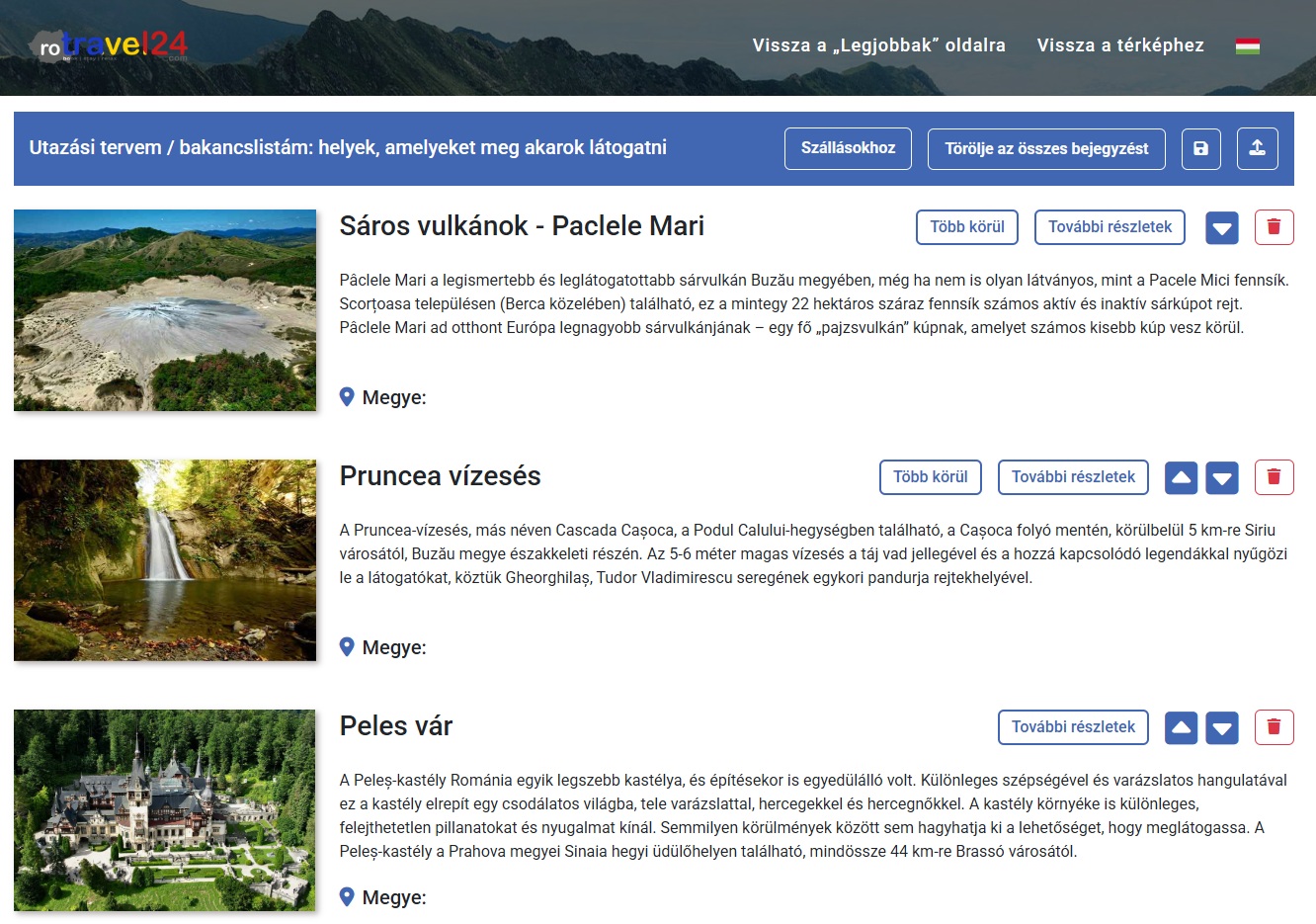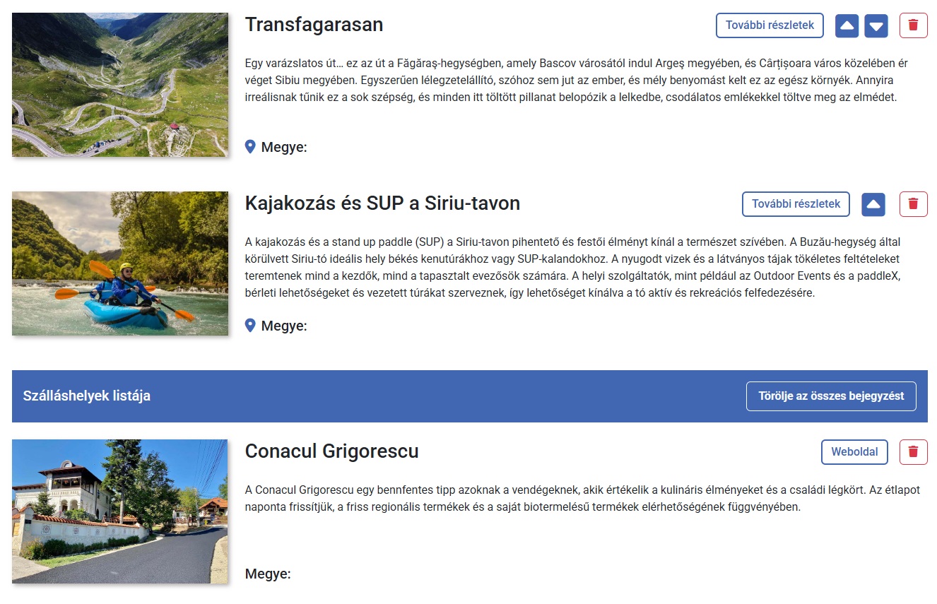 Nap mint nap azon dolgozunk, hogy javítsuk kínálatunkat és bővítsük a „Legjobbak” részben található információkat, valamint utazási ajánlatainkat, élményeinket és még sok minden mást. Jelenleg több mint 400 romániai utazási célpontot találhat a „Legjobbak” részben. Az év végéig ezt hetente 800 célpontra bővítjük, majd 2026-ra összesen 2000-re. Jelenleg az új „Saját utazási terv / Bucket List” funkción is dolgozunk. Ez lehetővé teszi, hogy bármilyen utazási célpontot, valamint szállodákat, borászatokat, éttermeket és még sok mást hozzáadjon személyes utazási tervéhez. Ezt az utazási tervet szerkesztheti, elmentheti, megoszthatja barátaival és még sok mást is tehet vele! A munka folyamatos, és hónapról hónapra a roTravel24 egyre több funkciót kínál.