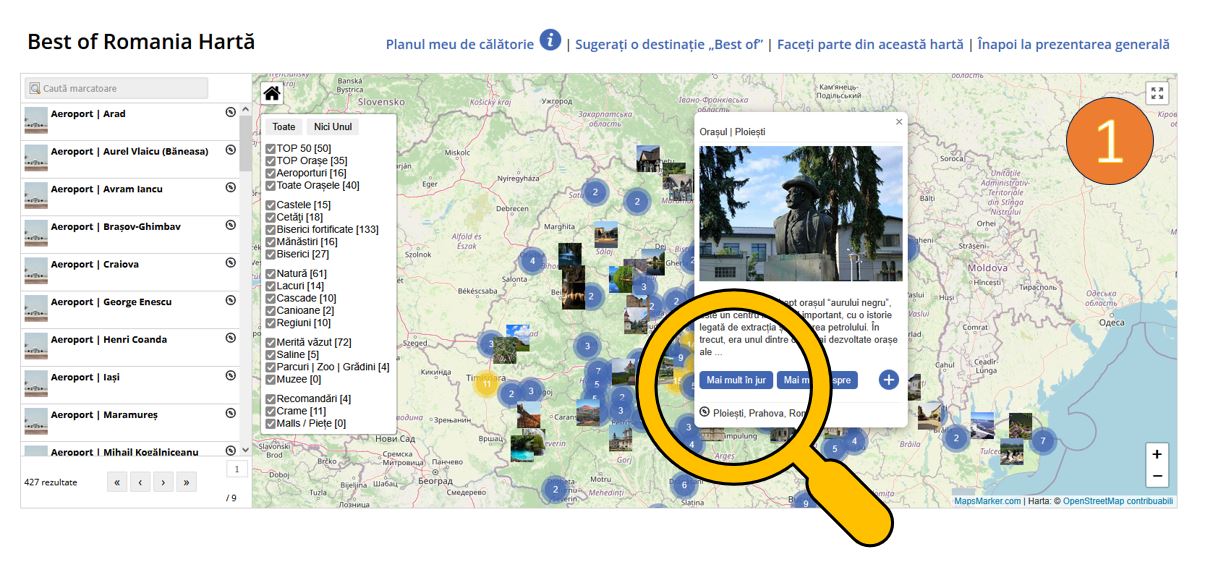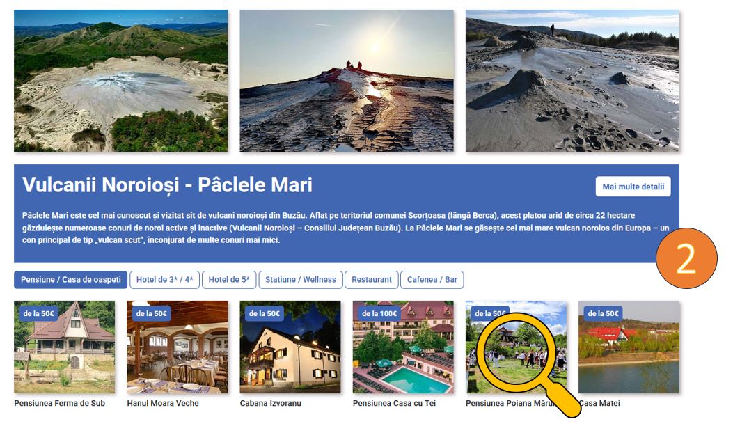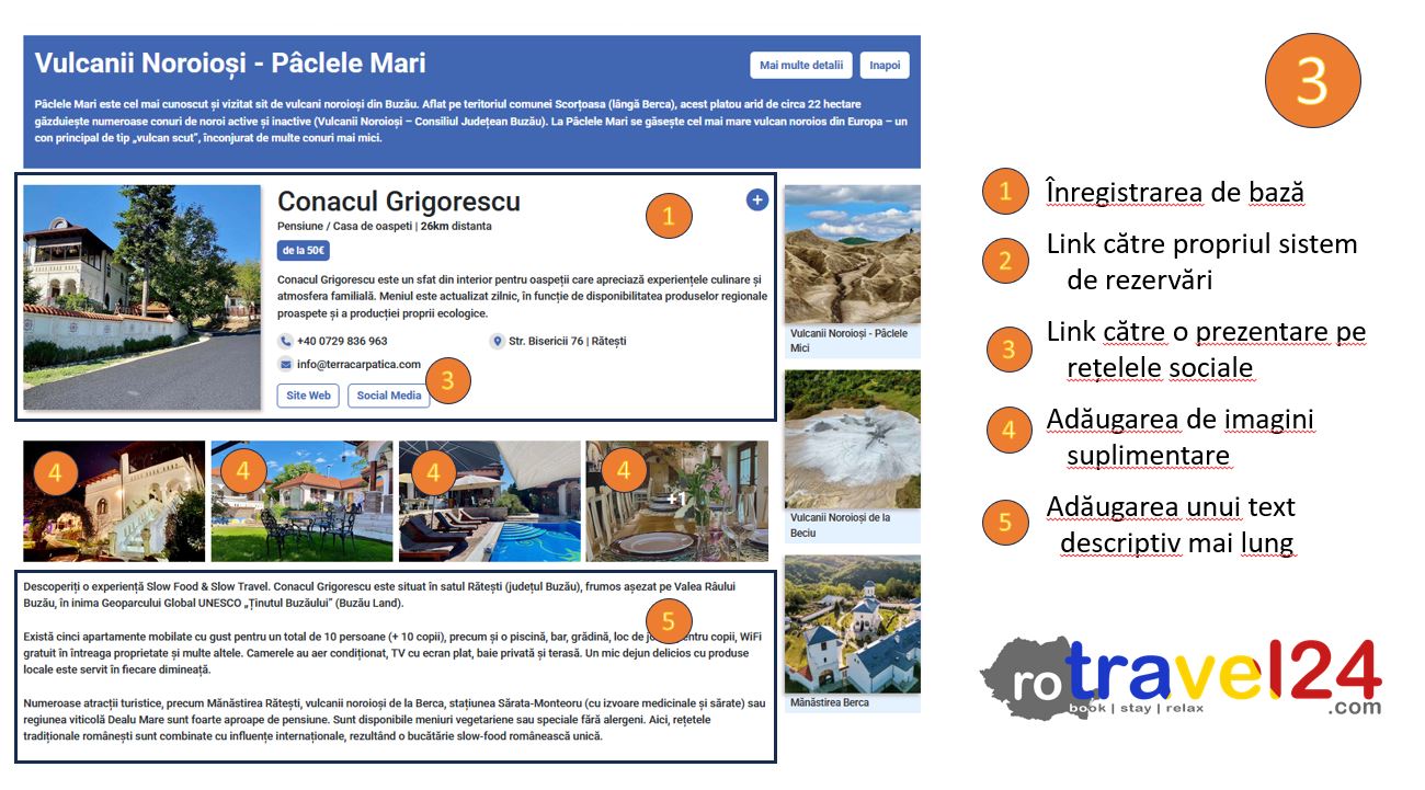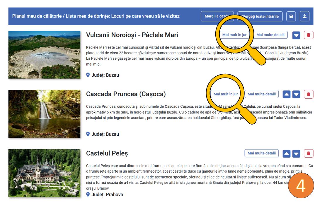 Pentru fiecare destinație de pe harta roTravel24, există posibilitatea de a afla mai multe despre împrejurimile destinației cu ajutorul funcției „Mai mult în jur” (imaginea 1). De îndată ce un utilizator selectează această funcție, primește o prezentare generală a regiunii în care sunt afișate unitățile HoReCa și alte informații (imaginea 2). Cu un singur clic, vizitatorul poate vizualiza informații suplimentare despre un loc (imaginea 3). În măsura în care există înregistrări, funcția „Mai mult în jur” este afișată și în „Planul de călătorie” al vizitatorului. Costul unei înregistrări de bază este de 2,95 RON pe destinație și pe lună. Se pot rezerva opțiuni suplimentare (lista de prețuri mai jos).